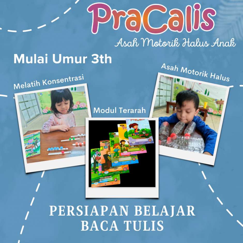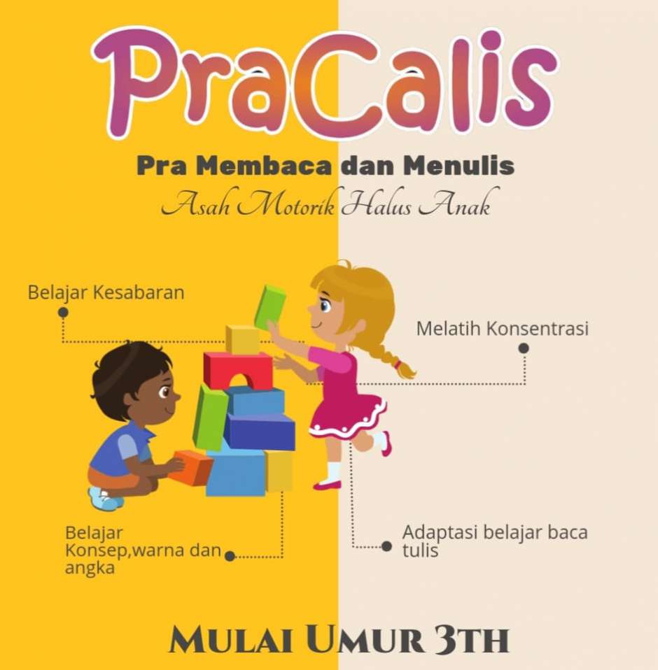Anak belajar PraCalis mulai dari umur 3 sampai 4,5 tahun. Setelah itu jika anak sudah paham warna, menyebutkan nama benda, dan motorik halus anak sudah siap, maka anak bisa masuk kelas baca.