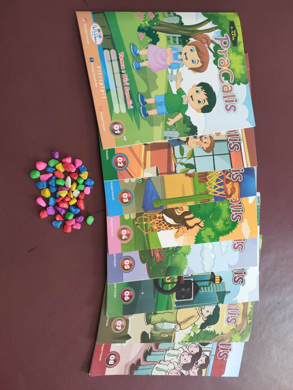 Modul PraCalis sebagai media anak belajar. Modul PraCalis ada 8 tema. 1. Tema diri sendiri 2. Tema Keluargaku 3. Tema lingkungan 4. Tema Binatang 5. Tema Tanaman 6. Tema Kendaraan 7. Tema Alam Semesta 8. Tema Negaraku